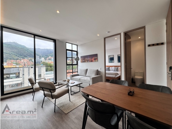 Área m² Espacios con Valor, ofrece para arriendo LINDO APARTAMENTO TOTALMENTE AMOBLADO PARA ESTRENAR ubicado en el corazón del parque de la calle 93. EL VALOR DEL ARRIENDO INCLUYE SERVICIOS (AGUA, LUZ, INTERNET Y ENERGÍA) Y EL VALOR DE LA ADMINISTRACIÓN. Apartamento de 54 con linda vista hacia los cerros orientales. El apartamento tiene techo alto y ventanales de techo a piso y tiene balcón. La zona social es abierta hacia la cocina con sofá cama y mesa de comedor. Tiene una amplia alcoba y 2 baños. La cocina abierta es muy moderna con todos los electrodomésticos y equipos de cocina. El mesón es de Quartzone. Zona de lavandería independiente con lavadora secadora marca Whirlpool. La alcoba viene con cama doble, lencería, dos mesas de noche y televisión de 50 pulgadas. El apto. tiene un parqueadero privado. El edificio tiene en la terraza con vista 360 grados, dos áreas para coworking, BBQ y zona de lavandería adicional. Perfecto para ejecutivos y empresas. Nuestra página web es http://aream2.com.co/